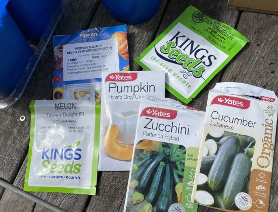 Let’s start with the cucurbits – zucchini, cucumber, pumpkins and melons. They’re big seeds so we sow them in the pot they’ll be planted out of and we use straight potting mix.