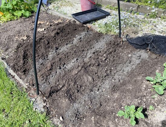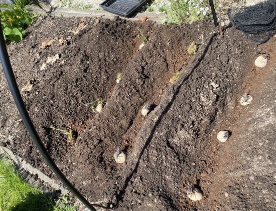 create trenches for them alongside the Jersey Bennes, and in they go. A handful or two of Neem granules to ward off psyllids,