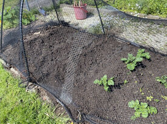 then cover over as best you can (these guys have super long chits), a handful or two of Morganics, a water and net. These will be enjoyed at Christmastime!