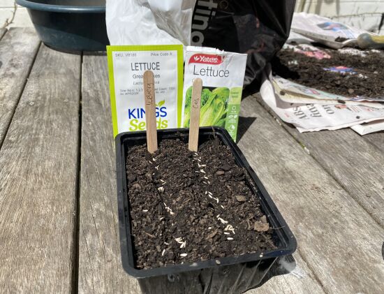 and lettuces – Iceberg-type and Cos. We have to go back to sieving the potting mix now as these are finer seeds, creating rows, then sowing, and these seedlings will be pricked out individually into their own cells when they get their second leaf.