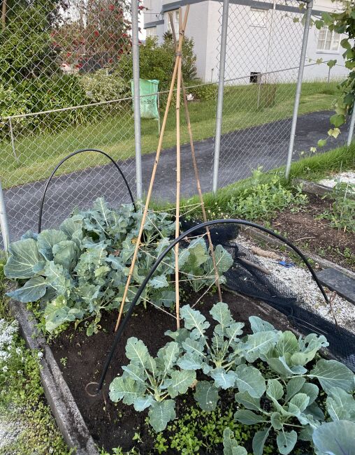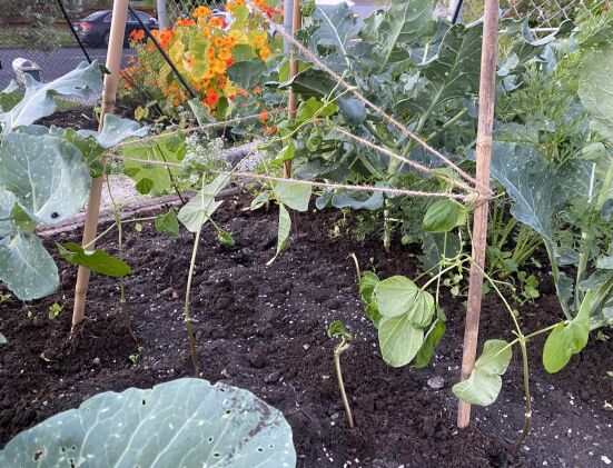 Just no room for our beans, so I’ve made a little teepee in among the last few brassicas. It would have been better to have it at the end of the bed, but I’m not sacrificing any more brassicas. Tie a string round and round for the beans to climb up. Beans are not overly hungry plants, and I know the soil in this bed is not depleted, so after planting I just add a few handfuls of Morganics round each plant and water them in well.