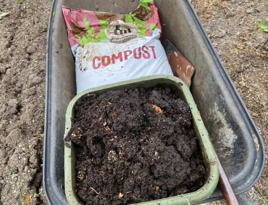 Layer on chicken manure or sheep pellets. Compost goes on next. And using your fork, work it all in together lightly.
